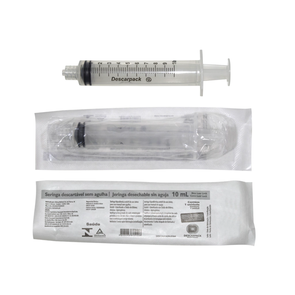 A Seringa Hipodérmica 10 Ml Luer Lock Sem Agulha da Descarpack é uma seringa descartável, projetada para o uso para a aplicação de medicamentos ou outras substâncias por via parenteral. Pode ser usada também para a coleta de sangue.